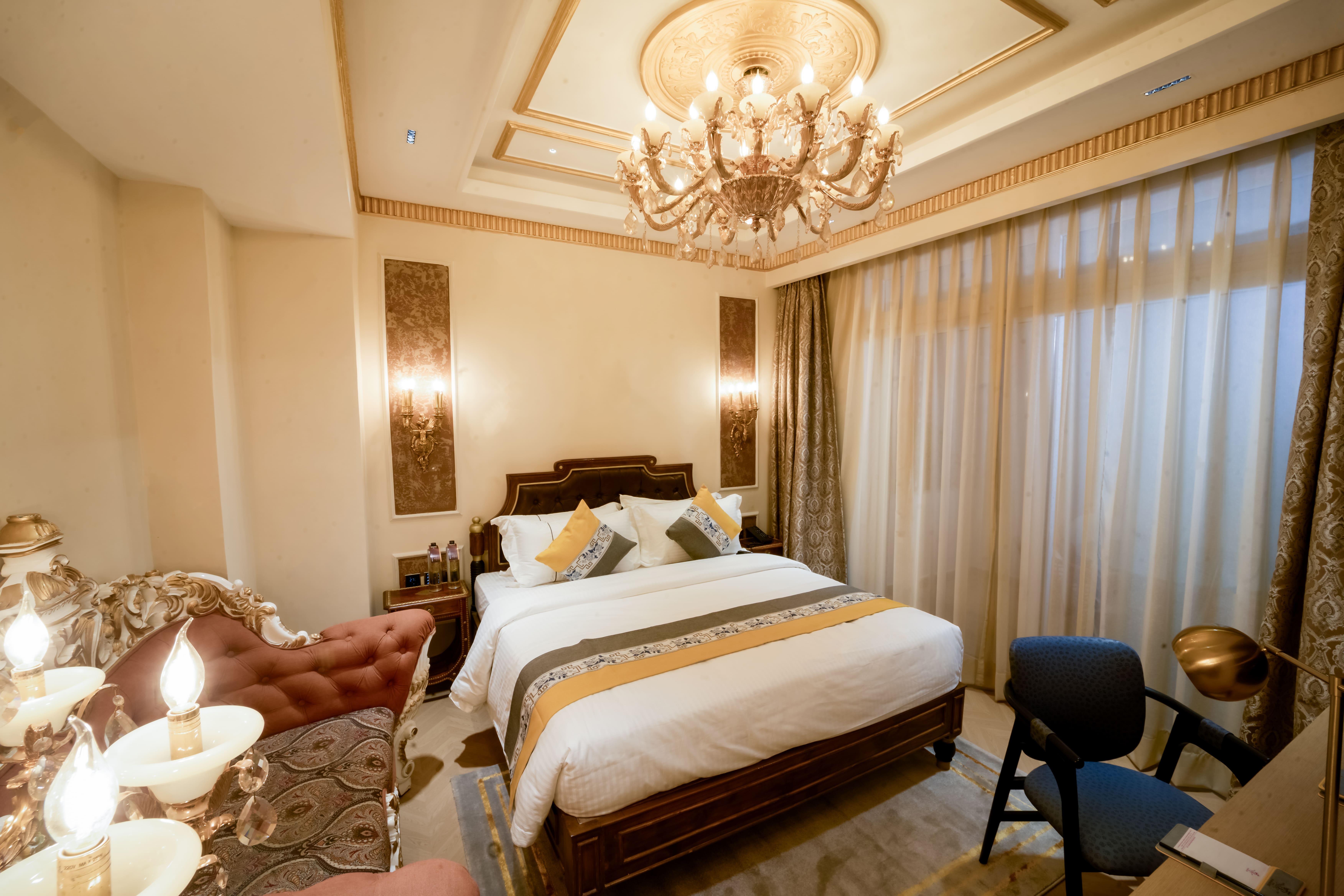 Step into a world of regal elegance with the Royal Heritage Suite at The Panache Kautilya, where every detail reflects classic luxury and refined craftsmanship. Featuring a majestic king-size bed, ornate furnishings, and a beautifully designed seating area, the suite captures the essence of royal living. From the statement chandelier to the intricate décor elements, the ambiance is warm, sophisticated, and reminiscent of timeless grandeur—offering a stay that feels both luxurious and deeply inviting.