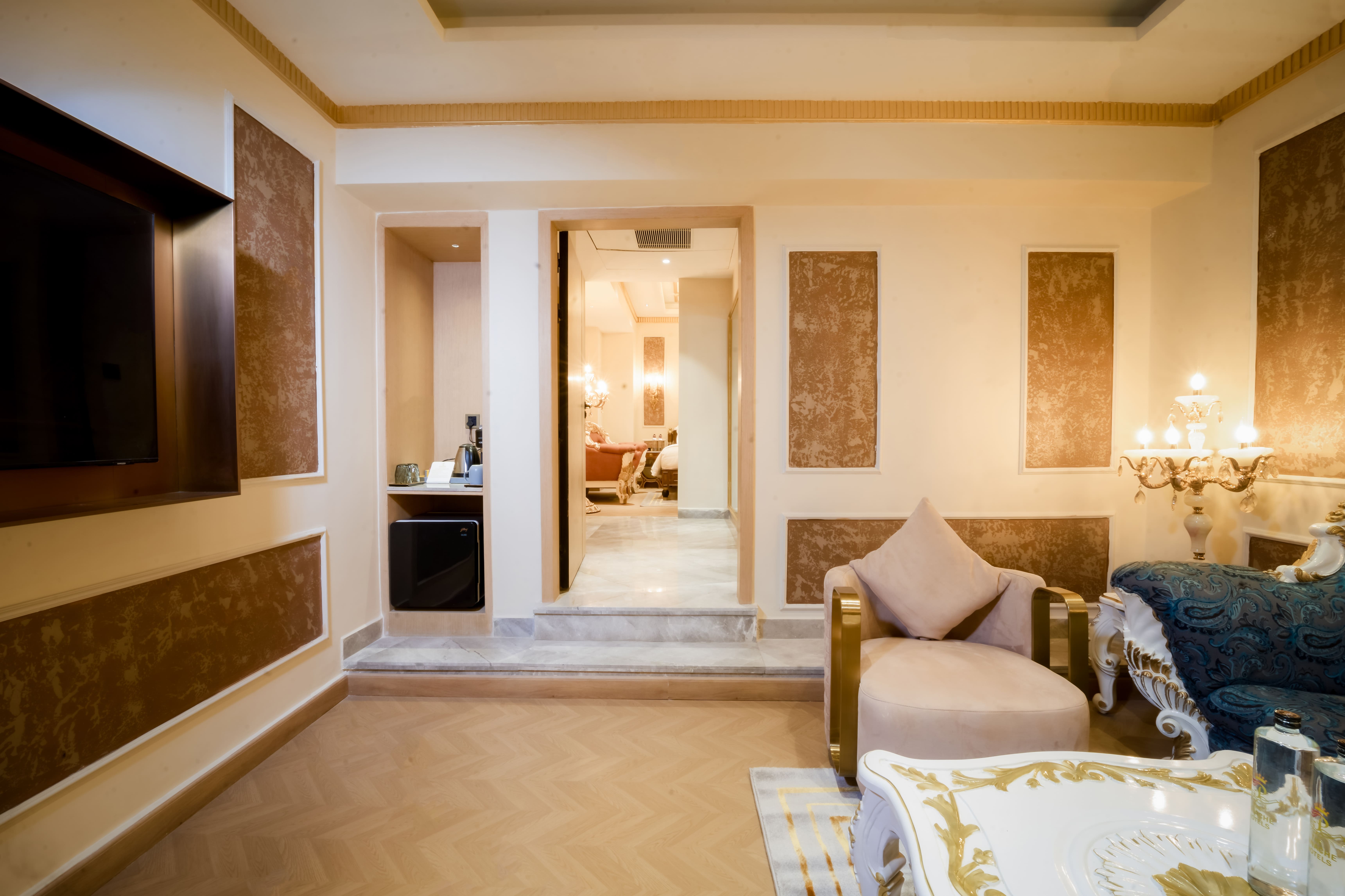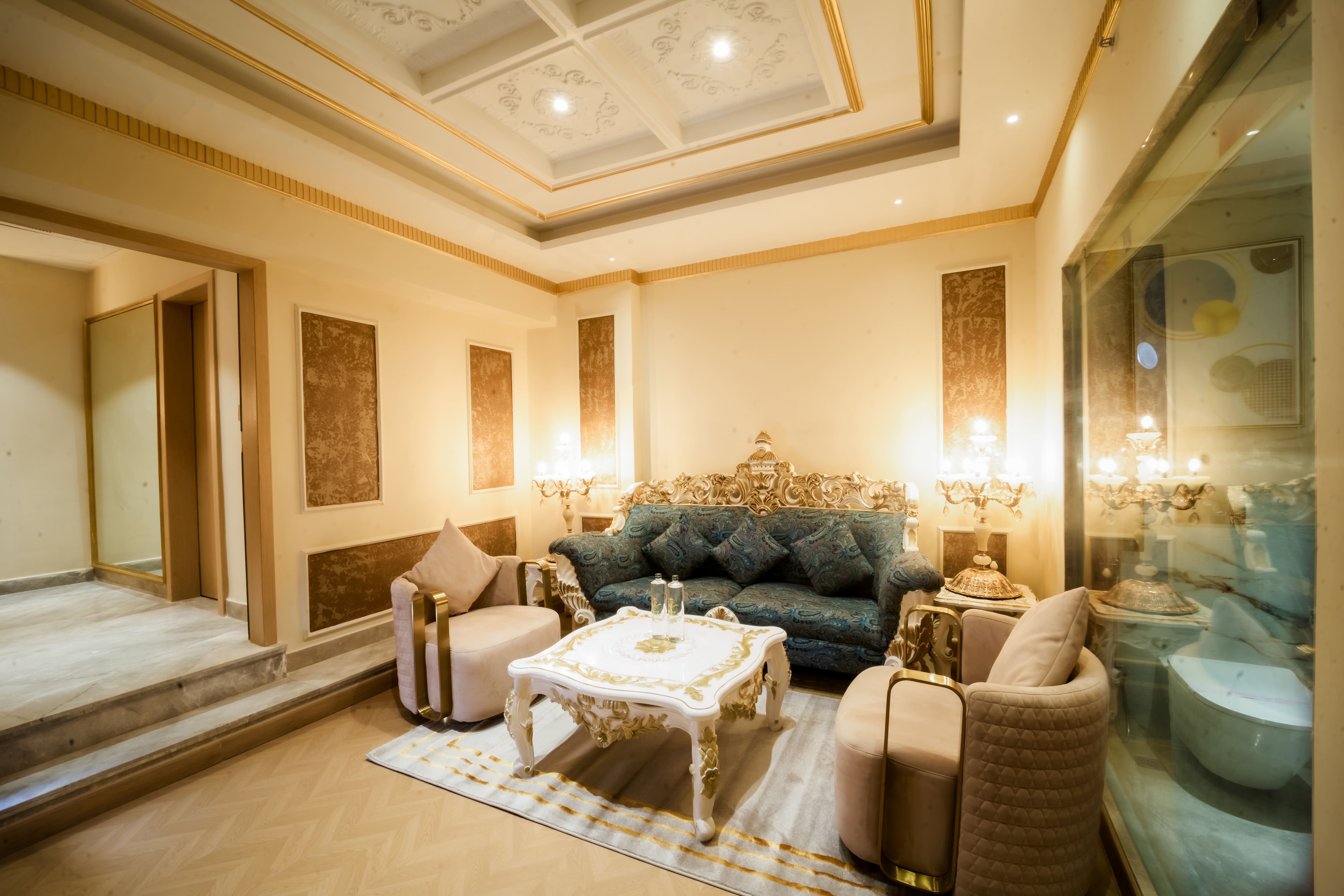 Every corner of the Classical Room at The Panache Kautilya is designed to make comfort feel regal. The richly upholstered blue sofa with intricate gold accents, the plush armchairs, and the carved coffee table together create an atmosphere that is both inviting and majestic. Gold-trimmed wall panels, warm sconces, and marble finishes add layers of refinement, blending classical artistry with modern indulgence.